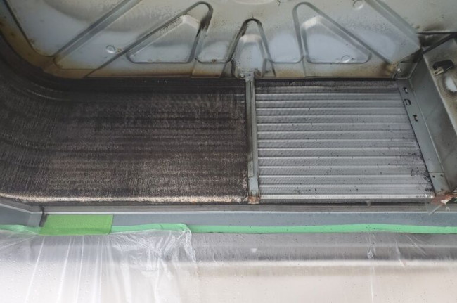 1年もたたずに真っ黒になってしまいます。最低でも年2回程度は清掃を行う事をお勧め致します。また、エアコンも排ガス等の影響で内部が煤によりだいぶ汚れていており、吸い込んだ空気が出てくる際に、その汚れをまき散らしてしまいます。すると壁面のクロスや天井等も黒ずみの汚れが発生してしまいます。何よりもそれを呼吸により、人が吸い込んでしまって方が問題かと思います。定期的な清掃をお勧め致します。